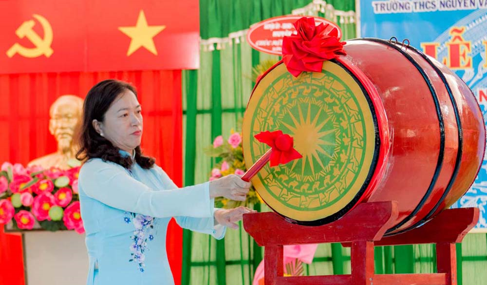 Cô Nguyễn Thị Oanh - Hiệu trưởng nhà trường đánh trống khai giảng năm học mới 2018-2019